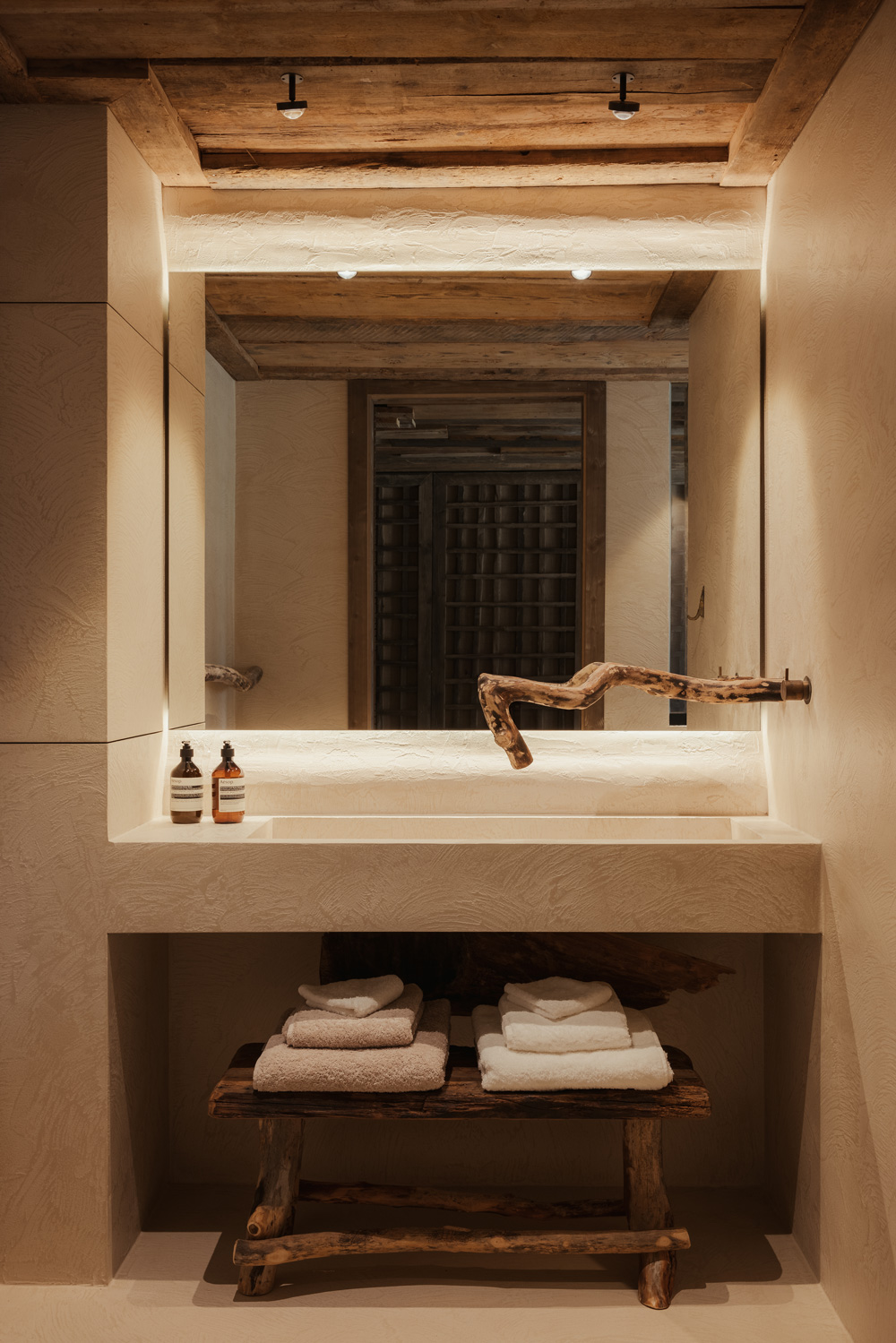 Inside, the aesthetic remains linear and refined, with every detail crafted by hand. The hotel features only nine suites, a spa area with two saunas and three warm pools inspired by Japanese onsen. Natural light floods in through large windows that seamlessly connect interior spaces with the exterior landscape, while technology is intentionally kept to a minimum to preserve an authentic experience.