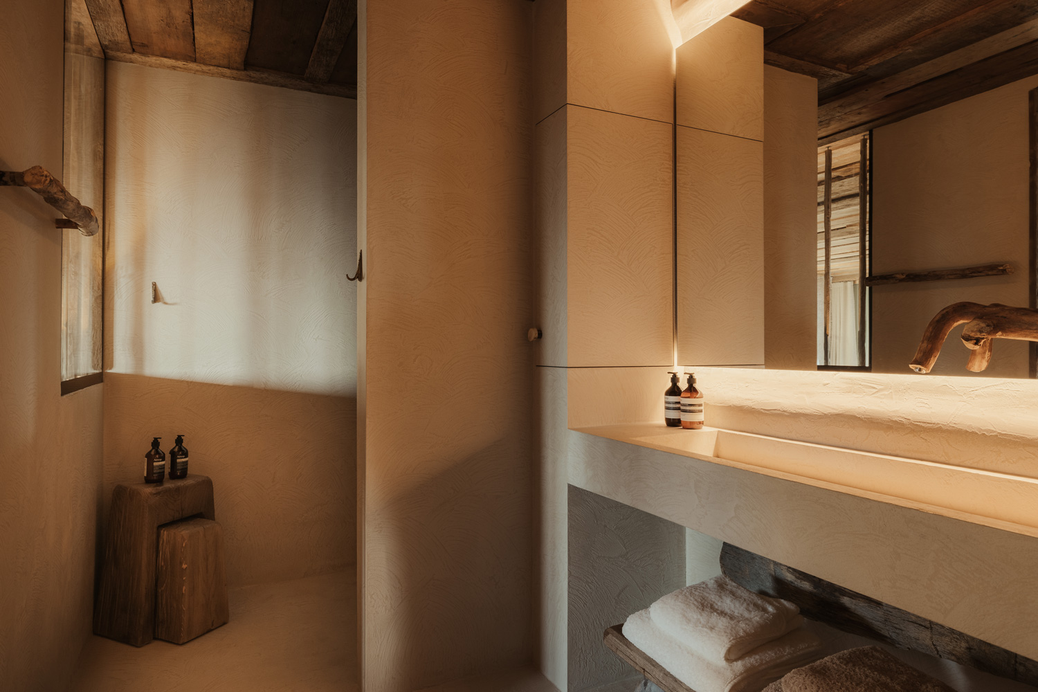 Amidst an atmosphere dominated by wood, stone, and wool, the choice of Ideal Work’s Microtopping® to cover various surfaces introduces an element of continuity and minimalism. Its seamless appearance — a key aesthetic feature for achieving visual purity — and its neutral tone combine harmoniously with the natural textures around it.
