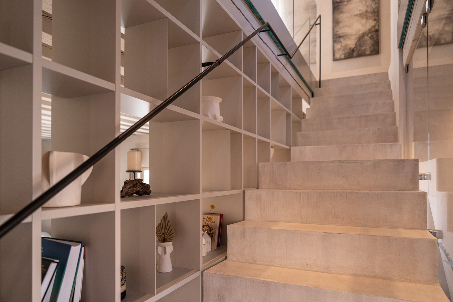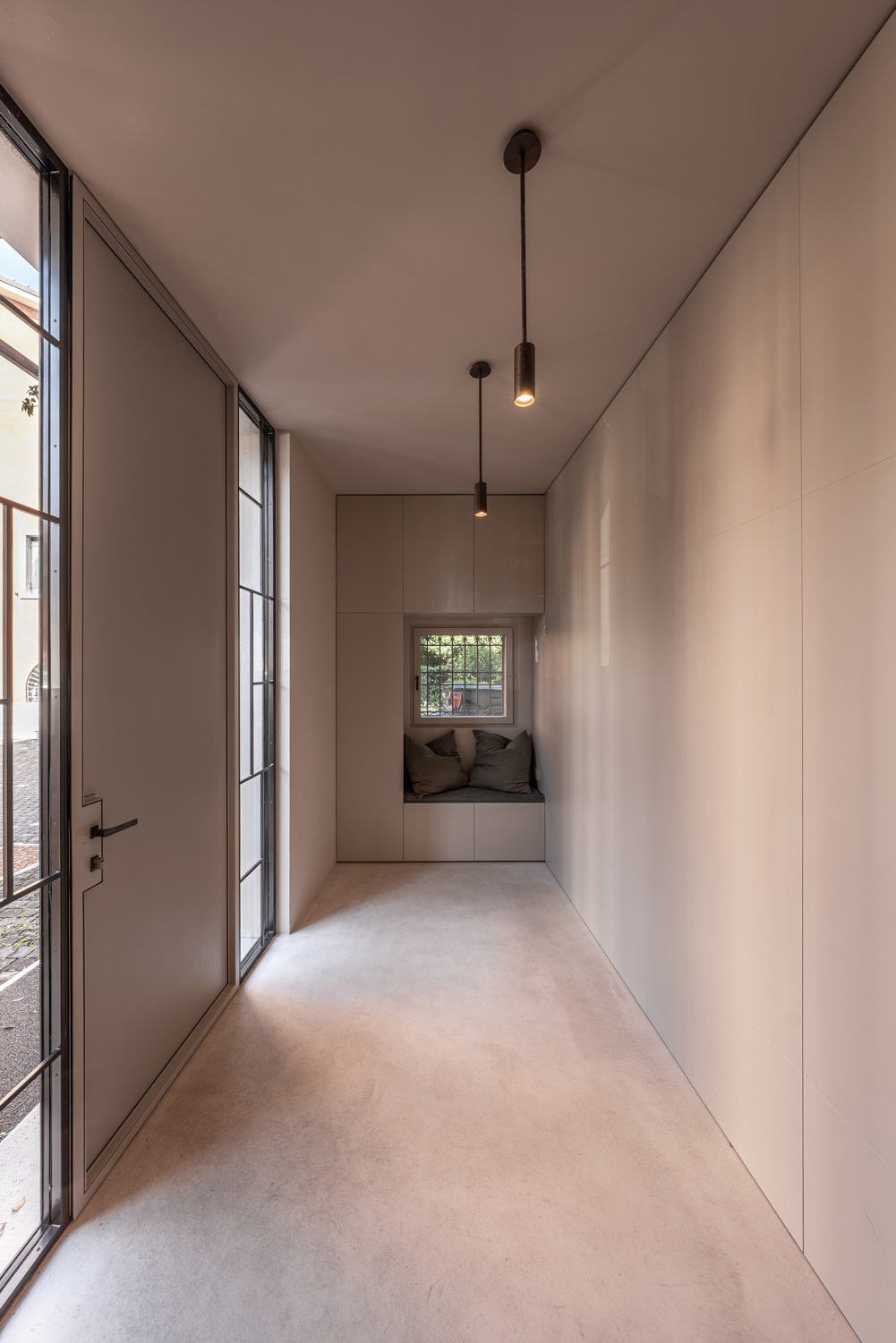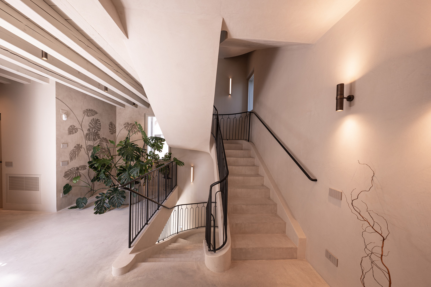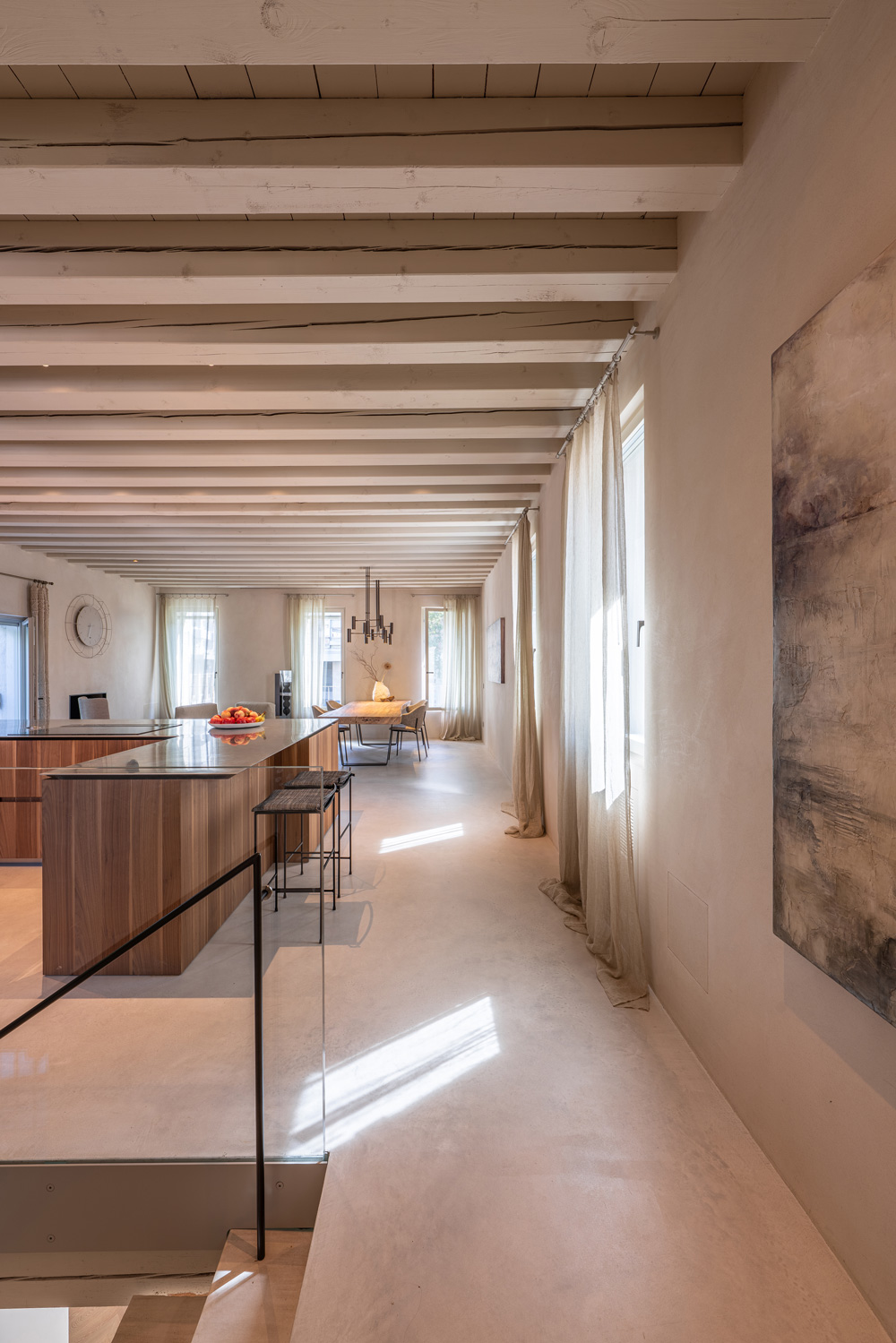 Nuvolato Architop® was applied to the floor and the central staircase to bring together the different units. This cement-based solution by Ideal Work, with its industrial appeal, maintains the robustness of concrete in just a few millimetres (3–4 mm) while offering greater aesthetic refinement. Within the context of Palazzo Tezzone, it was used to add a contemporary, edgy character while maintaining a neutrality that blends seamlessly with the historic elements of the residence. It is also an ideal solution for renovation projects, as it allows both interior and exterior floors to be renewed without demolition—even in the presence of underfloor heating systems.