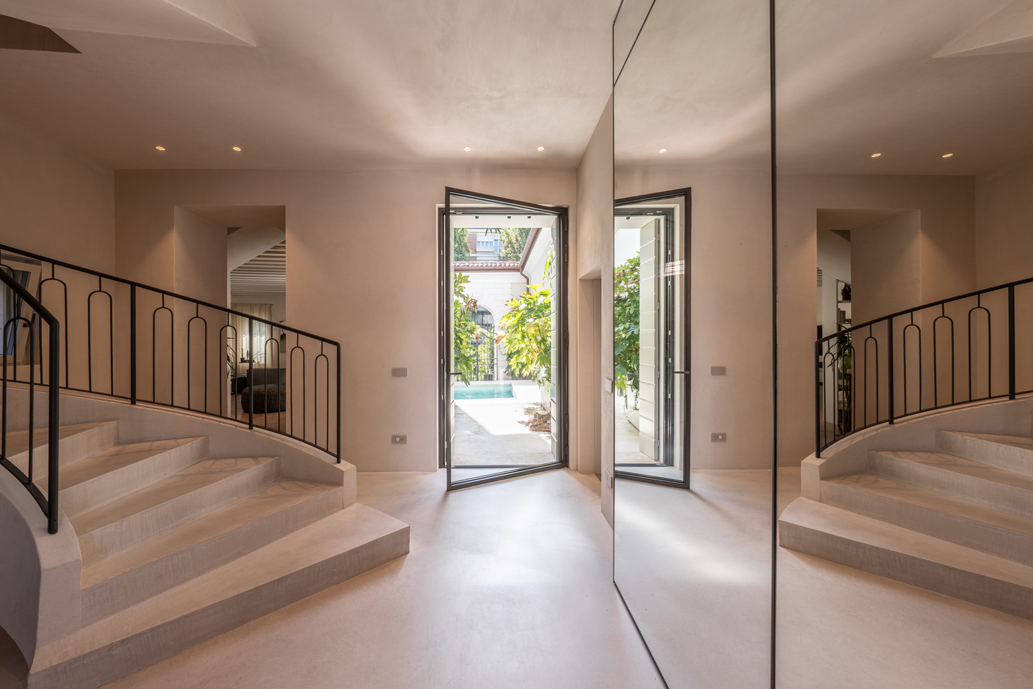 Inside, the building is articulated into three residential units organized around a central heart—the courtyard—conceived as a small secret garden featuring a swimming pool and framed by the greenery of surrounding trees that both define and protect it. The staircase acts as a connective thread, linking the levels through a fluid spatial sequence that generates ever-changing perspectives and unifies the palace as a single, coherent organism. The interiors reflect these overarching intentions: connected, open, and light-filled rooms defined by a restrained selection of elements, carefully chosen and harmoniously integrated. The color palette is essential, composed of light and neutral tones that enhance and diffuse natural light throughout the spaces. The kitchen, in wood and metal, plays a central role, introducing an industrial note within the overall composition.
