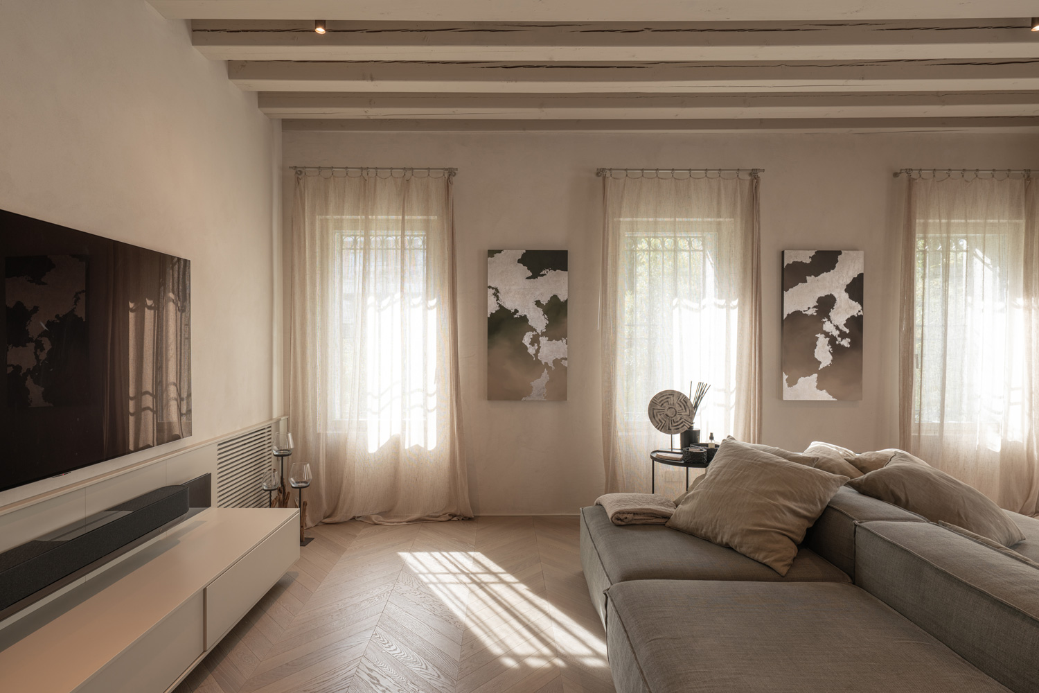 Light, spatial continuity, and integration with the surrounding landscape guide the respectful yet decisive transformation of Palazzo Tezzone, designed by MMP Studio in Treviso. Essential materials and neutral tones combine with the seamless continuity of Nuvolato Architop®, contributing to a seamless fluidity between spaces.
