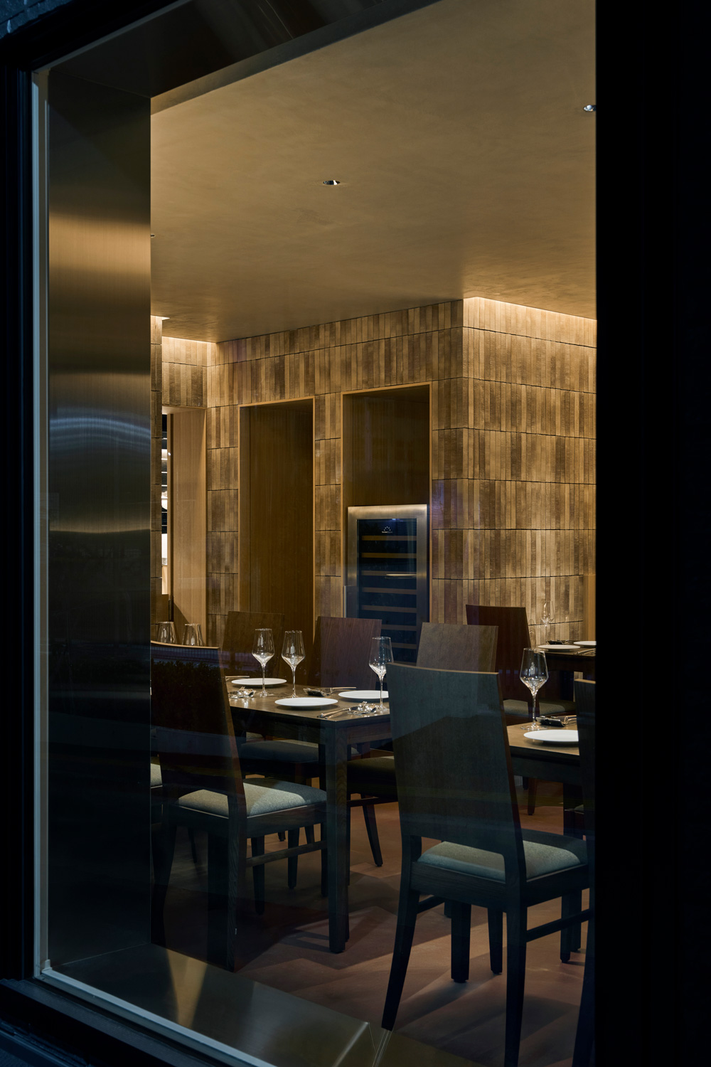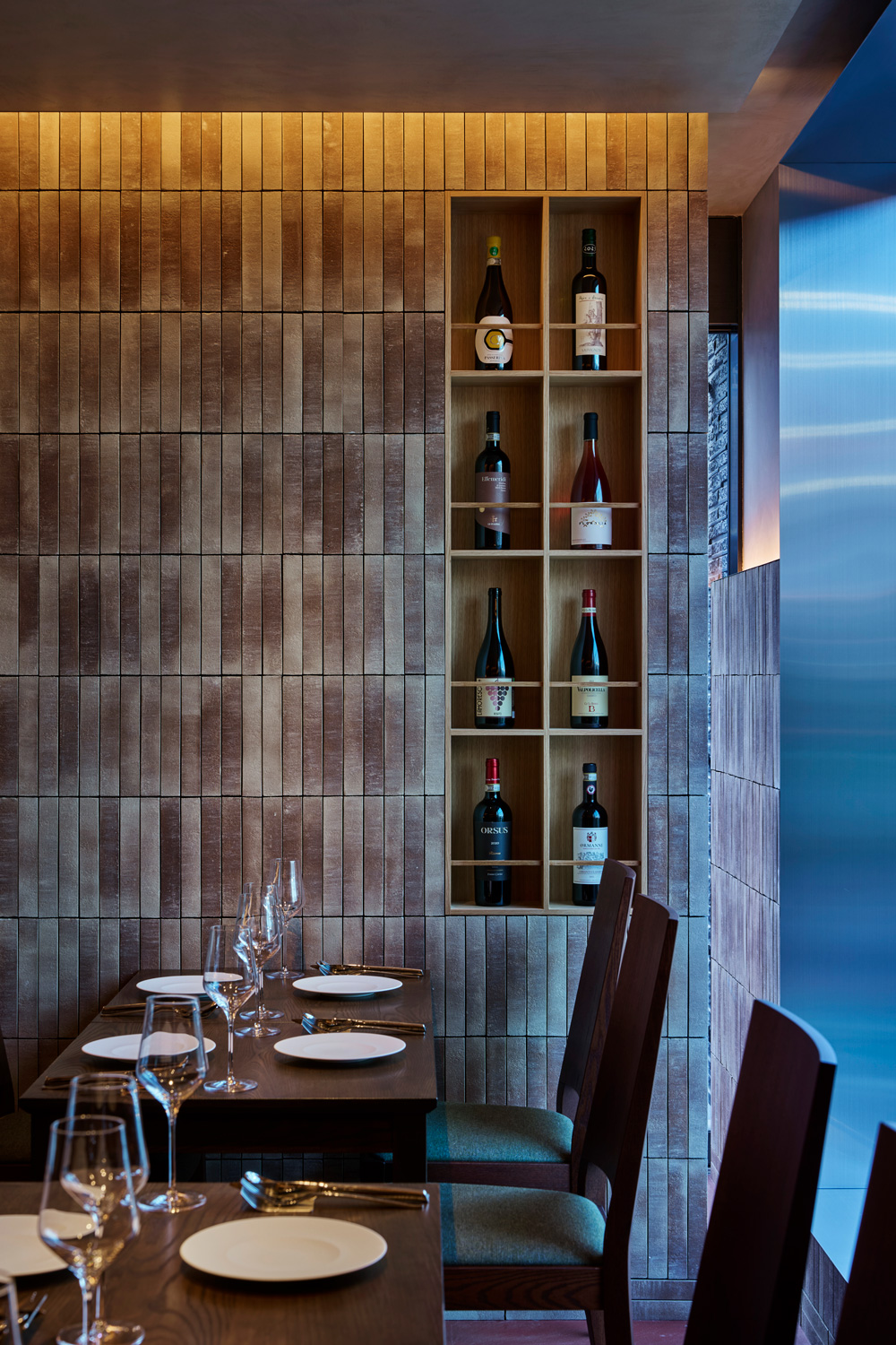 In harmony with the quiet nature of the neighborhood, the interior unfolds through layered compositions that evoke silent geological strata and diverse textures. The use of materials such as concrete, stone, and wood was a deliberate choice to transport visitors deep into the earth. For the walls, ceramic tiles with a variable firing effect (yōhen), made using nickel and manganese, were selected. No two tiles share the same color: each features a distinct shade, creating natural chromatic irregularities that lend the space an organic rhythm and a subtle sense of movement.