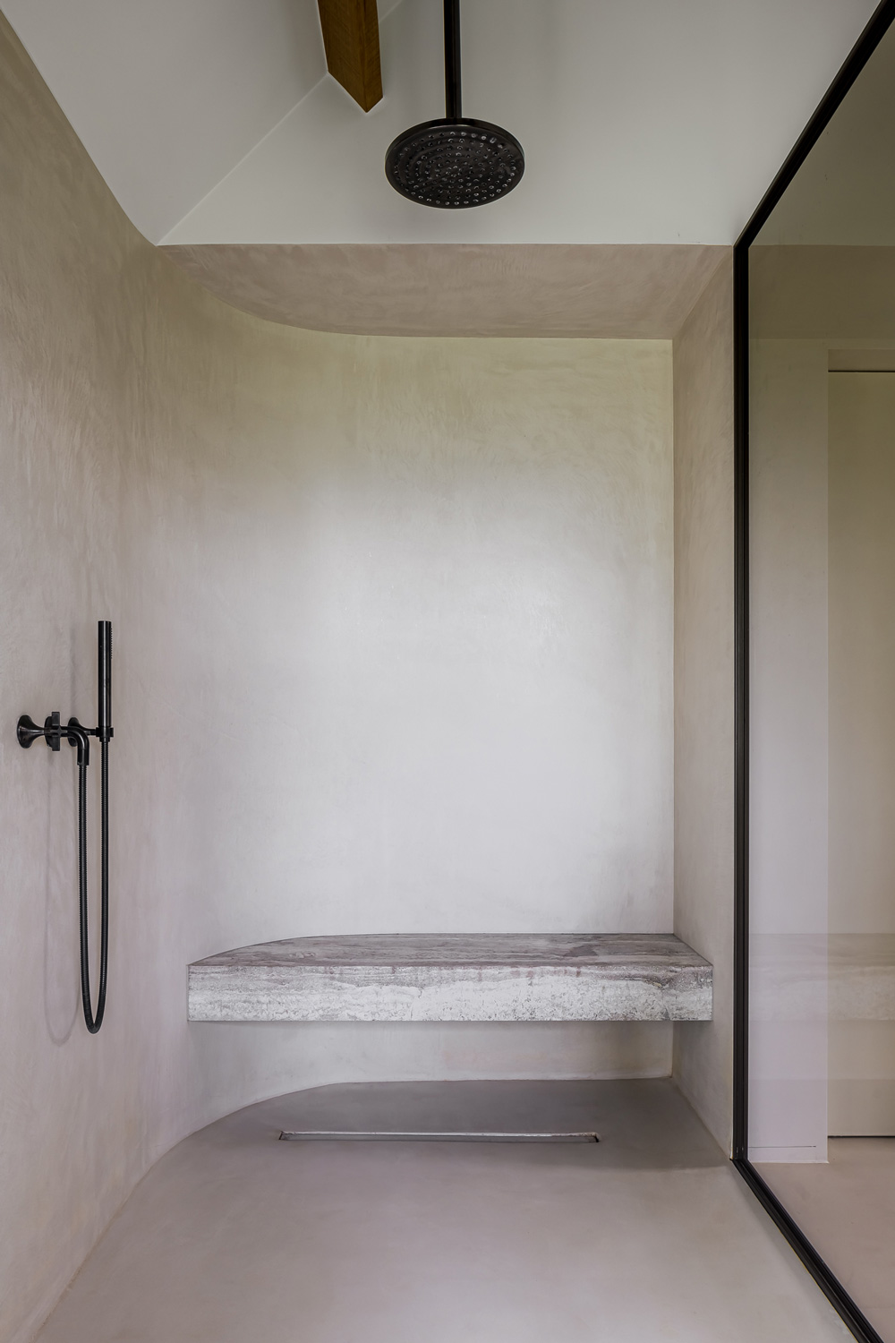 In the bathroom, Microtopping® covers the floor, the walls, and even the shower enclosure, whose rounded form softens the clean lines of the material. The result is a sensory experience of calm and relaxation. The pairing with natural stone—used for the sink, shower bench, and bathtub detailing—creates a pleasing visual and tactile contrast between textures, giving the bathroom a refined contemporary elegance.