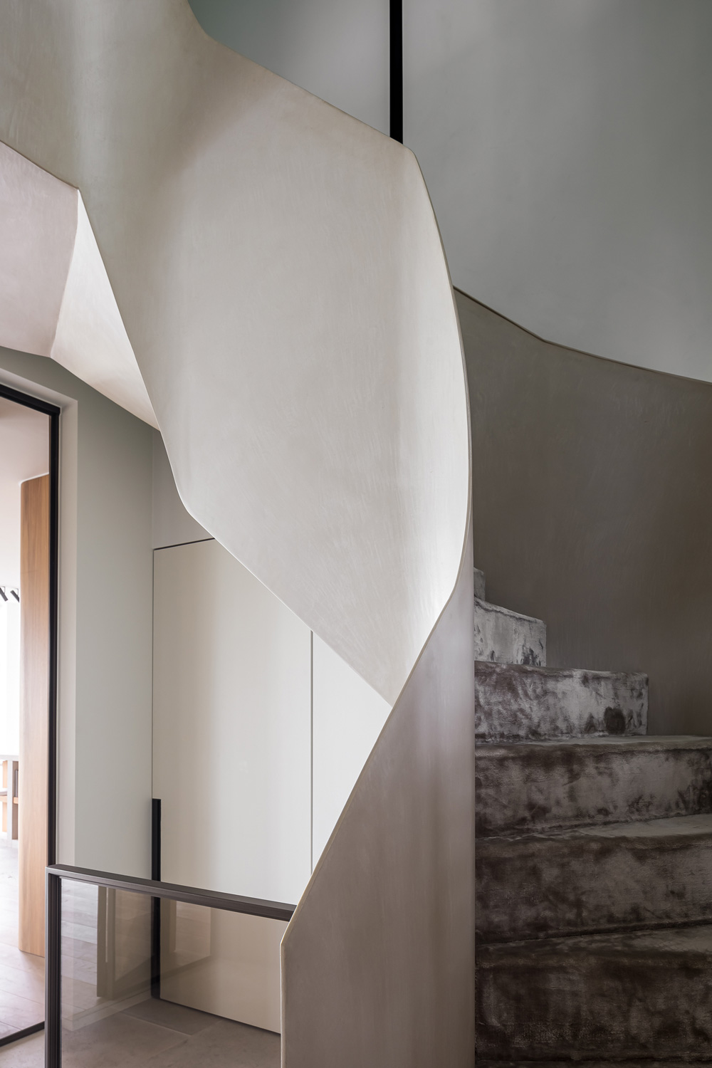 With continuity as one of the project’s central themes, Microtopping® discreetly becomes a key presence within the interiors. Applicable to any surface—horizontal or vertical—with a thickness of just 3 mm, Microtopping® is among Ideal Work’s most versatile solutions. At the entrance, a sculptural staircase clad in Microtopping® immediately comes into view. The material follows every curve and line in a gentle, uninterrupted flow from bottom to top, transforming the staircase into a striking visual element. Used also to finish the living room bench, Microtopping® creates a focal point while offering comfortable, elegant seating. While the living area features wooden flooring, in the kitchen and dining area Microtopping® fluidly connects the spaces and highlights the craftsmanship of the central fireplace. The kitchen itself is essential and linear, integrating elegantly through dark, clean-lined cabinetry and a light stone countertop. The absence of superfluous elements enhances the quality of the materials and the precision of the construction details.